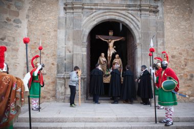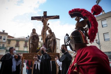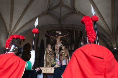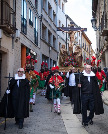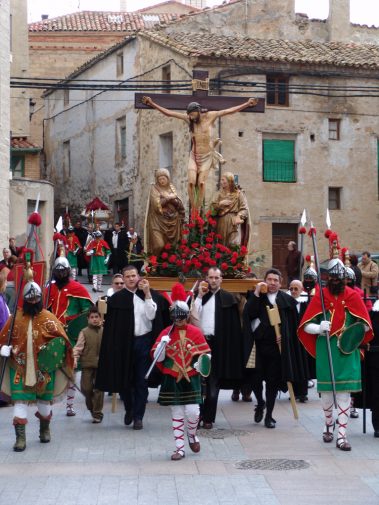 Precioso grupo escultórico renacentista, de principios del siglo XVI. Constituía un retablo, cuando estaba en la iglesia de Magaña, con adornos platerescos y cresterías góticas, de gran valor artístico. Procede de la capilla de los Marqueses de Castelmoncayo, que estaba a la izquierda del altar mayor. El Santo Cristo fue repintado, con poco acierto, en el año 1954. Las tres esculturas formaban el grupo primitivo del Calvario de Santa Mónica, llamado así porque la Cofradía, cuando su fiesta principal era el 3 de Mayo, celebraba un funeral el día 4 de Mayo (fiesta antiguamente de Santa Mónica) por los hermanos fallecidos. El Santo Cristo estaba en el retablo sin cruz, clavado a la pared. La cruz sobre la que se coloca actualmente fue realizada por el hermano de la Cofradía D. Félix Beamonte Val, que hizo un buen trabajo en la espalda del citado Santo Cristo para que pudiera salir en procesión. El pedestal de hierro con doble placa, así como los clavos de las manos y de los pies, fueron elaborados manualmente por el también hermano D. Luis Campos Ruiz, ayudándole D. José Rubio Omeñaca. Todos estos trabajos se terminaron a principios del año 1954. El nuevo paso, según estaba en el altar de la iglesia de Nuestra Señora de Magaña, sale en las procesiones del Viernes Santo desde 1986. Las figuras de San Juan y la Virgen, sobre todo, llaman la atención por su expresión máxima de dolor. Manifiestan una clara apertura hacia el realismo. Por sus actitudes, ropajes, cabeza y buena pintura estofada, algunos lo atribuyen a la escuela de Alonso Berruguete. Últimamente se cree que proceden de la escuela del artista valenciano Damian Forment, cuya casi totalidad de la obra se encuentra en Aragón (EL Pilar, San Pablo, la Magdalena y San Miguel de los Navarros, en Zaragoza; las catedrales de Huesca y Basbastro, etc.). Su gran parecido con la última obra del escultor en la catedral de Santo Domingo de la Calzada (La Rioja), especialmente las tallas de la Virgen y San Juan, parecen atestiguarlo. La última restauración llevada a cabo sobre este magnífico calvario fue realizada entre los años 1991 y 1992 por D. Mariano Nieto Pérez, exdirector del Museo Nacional de Escultura de Valladolid. Su costo superó el millón de pesetas que la Cofradía pagó con la ayuda de varios donativos. En el año 2006 se hizo un buen trabajo sobre las andas, remodelando las mismas, para realzar el gran valor artístico de este excelente conjunto escultórico. Tal trabajo fue realizado por una empresa de Calatayud.