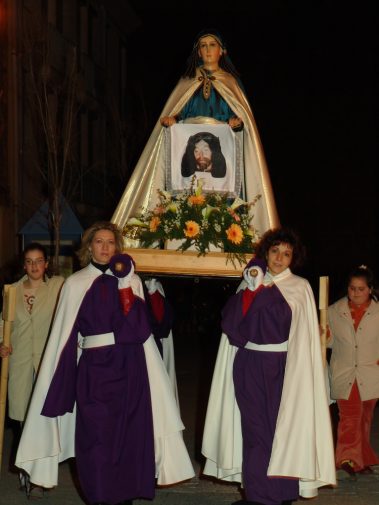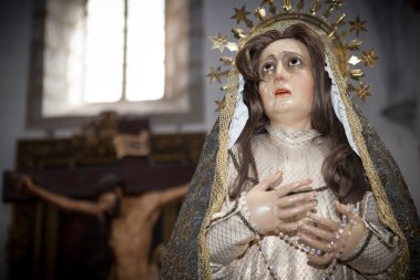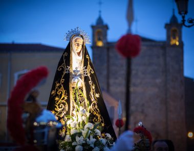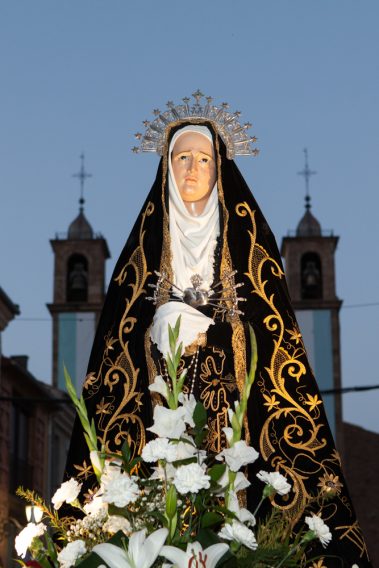 Esta imagen, vestida, de gran devoción entre las señoras de Agreda, especialmente, fue la primera que compró la Cofradía en el año 1593, un año antes que la del Santo Cristo de la Cruz a Cuestas. Fue realizada en Cascante (Navarra), y costó cuatro ducados de vellón. Por encarnarle el rostro y las manos se pagaron 31 reales más. Esta imagen recibe regalos con bastante frecuencia. El corazón con los siete cuchillos de plata y la corona fueron donación de Dª María Morales de Colomo en el año 1864. Sale en procesión sobre unas artísticas andas, en las que se hizo un pequeño cambio en 1989. Se quitó un adorno que llevaba en la parte frontal y en su lugar se puso un corazón traspasado por 7 espadas, inspirado en el que lleva sobre su pecho. Se realizó en Olvega y fue pagado el hermano D. Ángel Vicente Delgado. En el año 1992 se restauró esta imagen en Valladolid, por D. Mariano Nieto Pérez, logrando su aspecto actual. El día 15 de Septiembre del año 2000 se bendijo y colocó la nueva corona que lleva en las solemnidades. Es de plata, con doce estrellas, coronada de una cruz con esmeralda, realizada a mano por el maestro joyero de Zaragoza, D. Vicente Gazulla Leal. Fue pagada por la Asociación de Mujeres «El Moncayo», varias hermanas de la Cofradía y otras señoras de la Villa.