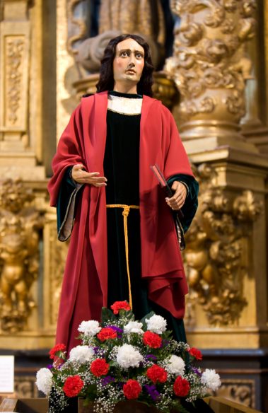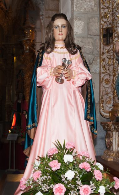 Imagen vestida, procede de la V.O.T. (Venerable Orden Tercera), del convento de los Padres Franciscanos de la Villa. Se restauró en 1954 y desde ese año hasta 1985, ambos inclusive, salía en la procesión del Viernes Santo a la izquierda del Cristo del Calvario de Santa Mónica. Al otro lado iba la Soledad. Desde 1986 procesiona solo. Antes llevaba sotana y manteo de Sacerdote, que todavía se conservan. También portaba una copa de cristal para recordar el veneno que le proporcionó el sacerdote pagano Aristodemo, en Efeso, que no le hizo ningún daño. Ahora lleva un libro en la mano izquierda. Representa el Evangelio que escribió.