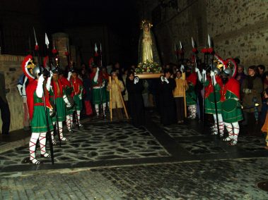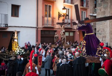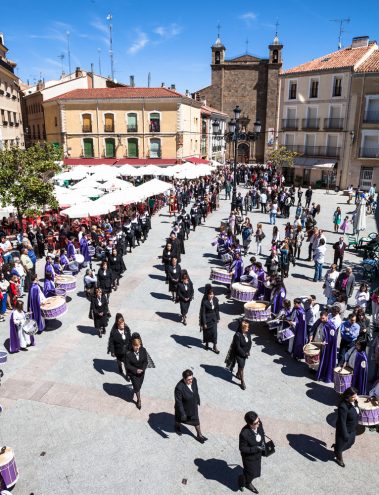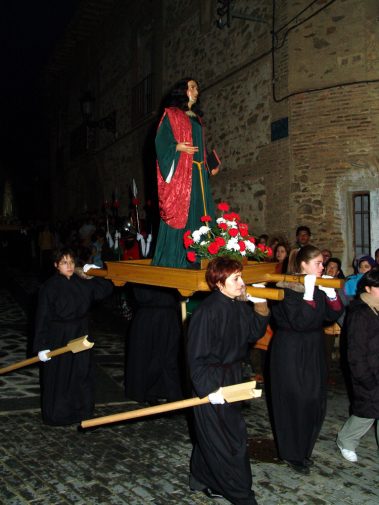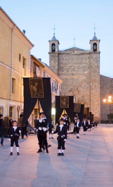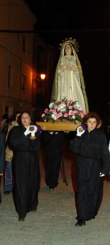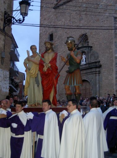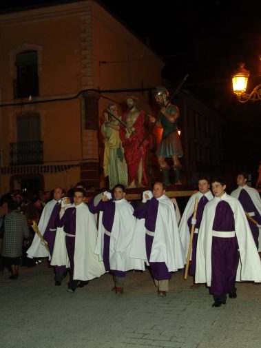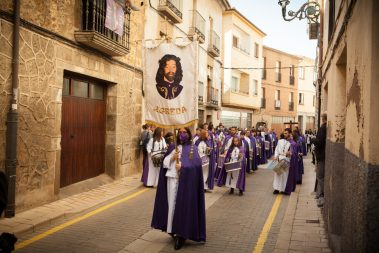 Portadores de los pasos. En las procesiones del Viernes Santo todos los pasos se llevan a hombros por un total de 72 personas, hombres y mujeres. Dependiendo del lugar que ocupen en la procesión se ponen túnica morada y capa blanca, túnica negra y algunos hombres vestimenta negra con la capa castellana del mismo color.